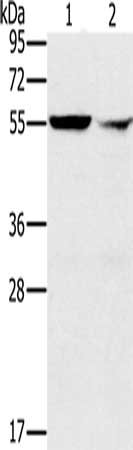• Gel: 8%SDS-PAGE, Lysate: 40 μg, Lane 1-2: K562 cells, human fetal liver tissue, Primary antibody: CSB-PA161857(PPM1F Antibody) at dilution 1/200, Secondary antibody: Goat anti rabbit IgG at 1/8000 dilution, Exposure time: 10 seconds