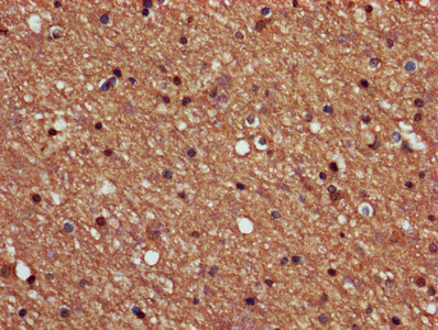 IHC image of CSB-PA018565LA01HU diluted at 1:600 and staining in paraffin-embedded human brain tissue performed on a Leica BondTM system. After dewaxing and hydration, antigen retrieval was mediated by high pressure in a citrate buffer (pH 6.0). Section was blocked with 10% normal goat serum 30min at RT. Then primary antibody (1% BSA) was incubated at 4°C overnight. The primary is detected by a biotinylated secondary antibody and visualized using an HRP conjugated SP system.