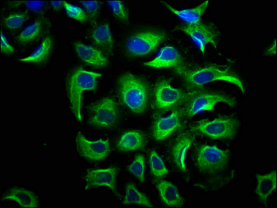 Immunofluorescence staining of A549 cells with CSB-PA018582LA01HU at 1:66, counter-stained with DAPI. The cells were fixed in 4% formaldehyde, permeabilized using 0.2% Triton X-100 and blocked in 10% normal Goat Serum. The cells were then incubated with the antibody overnight at 4°C. The secondary antibody was Alexa Fluor 488-congugated AffiniPure Goat Anti-Rabbit IgG(H+L).