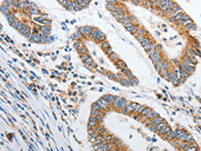 • The image on the left is immunohistochemistry of paraffin-embedded Human colon cancer tissue using CSB-PA912013(PRDX1 Antibody) at dilution 1/20, on the right is treated with synthetic peptide. (Original magnification: ×200)