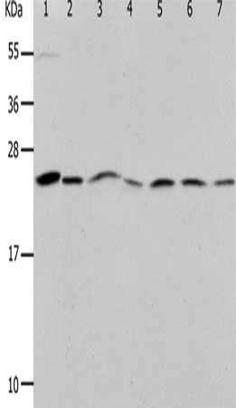 • Gel: 12%SDS-PAGE, Lysate: 40 μg, Lane 1-7: Mouse liver tissue, NIH/3T3 cells, RAW264.7 cells, 293T cells, K562 cells, Jurkat cells, hela cells, Primary antibody: CSB-PA912013(PRDX1 Antibody) at dilution 1/400, Secondary antibody: Goat anti rabbit IgG at 1/8000 dilution, Exposure time: 50 seconds