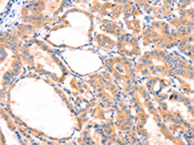 The image on the left is immunohistochemistry of paraffin-embedded Human thyroid cancer tissue using CSB-PA242653(PRDX2 Antibody) at dilution 1/80, on the right is treated with synthetic peptide. (Original magnification: ×200)