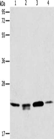 Gel: 12%SDS-PAGE, Lysate: 40 μg, Lane 1-4: 293T cells, hela cells, PC3 cells, human liver cancer tissue, Primary antibody: CSB-PA242653(PRDX2 Antibody) at dilution 1/750, Secondary antibody: Goat anti rabbit IgG at 1/8000 dilution, Exposure time: 10 seconds