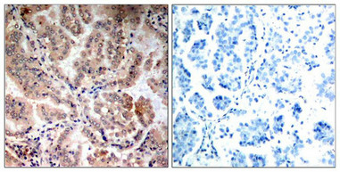 • Immunohistochemical analysis of paraffin-embedded human breast carcinoma tissue using AMPKa1/AMPKa2(Ab-174/172) Antibody(left) or the same antibody preincubated with blocking peptide(right).