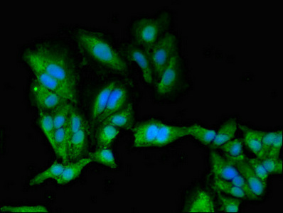 • Immunofluorescent analysis of Hela cells using CSB-PA018689LA01HU at dilution of 1:100 and Alexa Fluor 488-congugated AffiniPure Goat Anti-Rabbit IgG(H+L)