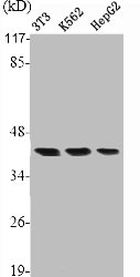 • Western Blot analysis of NIH-3T3 K562 HepG2 cells using PKA IIβ reg Polyclonal Antibody