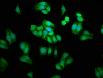 • Immunofluorescence staining of HepG2 cells with CSB-PA018838LA01HU at 1:66, counter-stained with DAPI. The cells were fixed in 4% formaldehyde, permeabilized using 0.2% Triton X-100 and blocked in 10% normal Goat Serum. The cells were then incubated with the antibody overnight at 4°C. The secondary antibody was Alexa Fluor 488-congugated AffiniPure Goat Anti-Rabbit IgG(H+L).