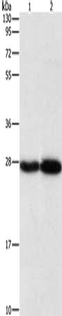 Gel: 10%SDS-PAGE, Lysate: 40 μg, Lane 1-2: Human testis tissue, mouse brain tissue, Primary antibody: CSB-PA955584(PSMB7 Antibody) at dilution 1/310, Secondary antibody: Goat anti rabbit IgG at 1/8000 dilution, Exposure time: 5 seconds
