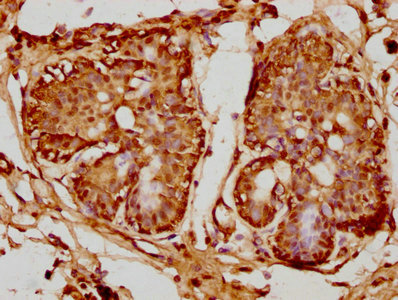 • IHC image of CSB-PA018886LA01HU diluted at 1:100 and staining in paraffin-embedded human breast cancer performed on a Leica BondTM system. After dewaxing and hydration, antigen retrieval was mediated by high pressure in a citrate buffer (pH 6.0). Section was blocked with 10% normal goat serum 30min at RT. Then primary antibody (1% BSA) was incubated at 4°C overnight. The primary is detected by a biotinylated secondary antibody and visualized using an HRP conjugated SP system.