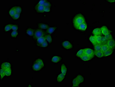 Immunofluorescence staining of PC-3 cells with CSB-PA018904OA01HU at 1:50, counter-stained with DAPI. The cells were fixed in 4% formaldehyde, permeabilized using 0.2% Triton X-100 and blocked in 10% normal Goat Serum. The cells were then incubated with the antibody overnight at 4°C. The secondary antibody was Alexa Fluor 488-congugated AffiniPure Goat Anti-Rabbit IgG(H+L).