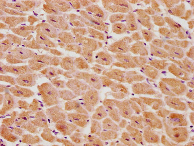 IHC image of CSB-PA018904OA01HU diluted at 1:100 and staining in paraffin-embedded human heart tissue performed on a Leica BondTM system. After dewaxing and hydration, antigen retrieval was mediated by high pressure in a citrate buffer (pH 6.0). Section was blocked with 10% normal goat serum 30min at RT. Then primary antibody (1% BSA) was incubated at 4°C overnight. The primary is detected by a biotinylated secondary antibody and visualized using an HRP conjugated SP system.