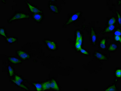 Immunofluorescent analysis of Hela cells using CSB-PA018994LA01HU at dilution of 1:100 and Alexa Fluor 488-congugated AffiniPure Goat Anti-Rabbit IgG(H+L)