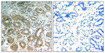 Immunohistochemical analysis of paraffin-embedded human breast carcinoma tissue using SHP-2(Ab-542) Antibody(left) or the same antibody preincubated with blocking peptide(right).