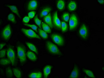 Immunofluorescence staining of A549 cells with CSB-PA614263LA01HU at 1:100, counter-stained with DAPI. The cells were fixed in 4% formaldehyde, permeabilized using 0.2% Triton X-100 and blocked in 10% normal Goat Serum. The cells were then incubated with the antibody overnight at 4°C. The secondary antibody was Alexa Fluor 488-congugated AffiniPure Goat Anti-Rabbit IgG(H+L).