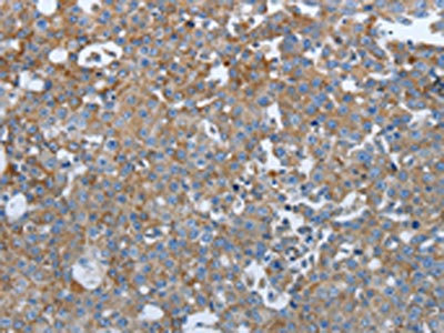 The image on the left is immunohistochemistry of paraffin-embedded Human liver cancer tissue using CSB-PA777341(PTPRJ Antibody) at dilution 1/40, on the right is treated with synthetic peptide. (Original magnification: ×200)