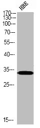 • Western blot analysis of HBE using p-Caspase-3 (S150) antibody.