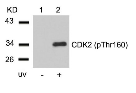 Western blot analysis of extracts from Hela cells untreated(lane 1) or treated with UV(lane 2) using CDK2(Phospho-Thr160) Antibody .