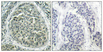 Immunohistochemical analysis of paraffin-embedded human breast carcinoma tissue using b-Catenin(Phospho-Ser37) Antibody(left) or the same antibody preincubated with blocking peptide(right).