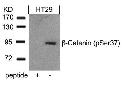 Western blot analysis of extracts from HT29 cells using b-Catenin(Phospho-Ser37) Antibody and the same antibody preincubated with blocking peptide .