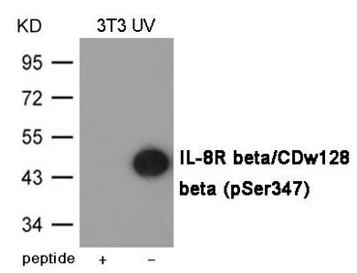 • Western blot analysis of extracts from 3T3 cells treated with UV using IL-8R beta/CDw128 beta (Phospho-Ser347) Antibody.The lane on the left is treated with the antigen-specific peptide.