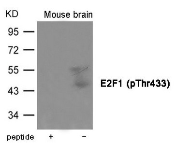 Western blot analysis of extracts from Mouse brain tissue using E2F1 (Phospho-Thr433) Antibody.The lane on the left is treated with the antigen-specific peptide.