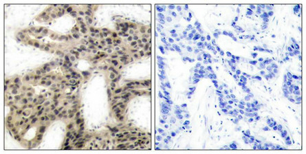 • Immunohistochemical analysis of paraffin-embedded human breast carcinoma tissue using 4E-BP1(Phospho-Thr45) Antibody(left) or the same antibody preincubated with blocking peptide(right).