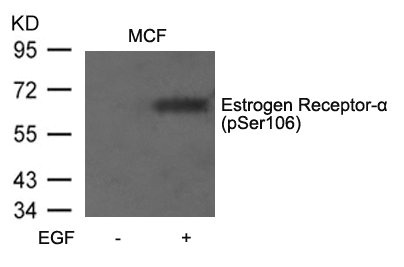 Western blot analysis of extracts from MCF7 cells untreated or treated with EGF using Estrogen Receptor-a(Phospho-Ser106) Antibody.