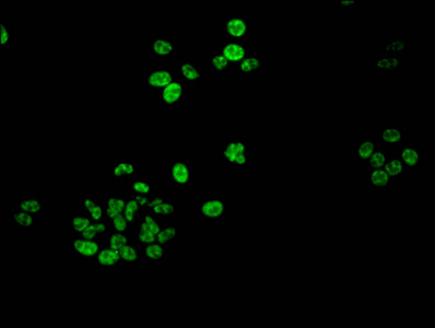 • Immunofluorescent analysis of HepG2 cells using CSB-PA010377PA188phHU at dilution of 1:100 and Alexa Fluor 488-congugated AffiniPure Goat Anti-Rabbit IgG(H+L)