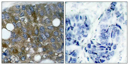 Antibodies were produced by immunizing rabbits with synthetic phosphopeptide and KLH conjugates. Antibodies were purified by affinity-chromatography using epitope-specific phosphopeptide. Non-phospho specific antibodies were removed by chromatogramphy usi