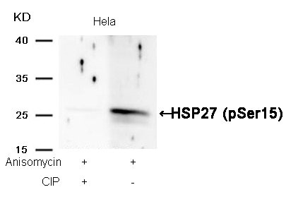 • Western blot analysis of extracts from Hela cells, treated with Anisomycin or calf intestinal phosphatase (CIP), using HSP27 (Phospho-Ser15) Antibody.