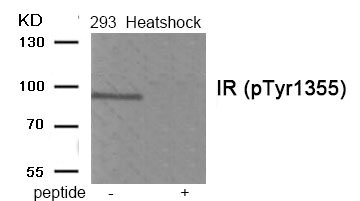 • Western blot analysis of extracts from 293 cells treated with Heatshock using Phospho-IR (Tyr1355) antibody.The lane on the right is treated with the antigen-specific peptide.