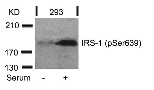 • Western blot analysis of extracts from 293 cells untreated or treated with serum using IRS-1(Phospho-Ser639) Antibody.