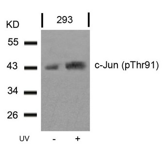 • Western blot analysis of extracts from 293 cells untreated or treated with UV using c-Jun(Phospho-Thr91) Antibody.