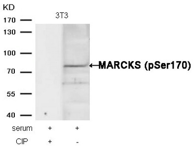 Western blot analysis of extracts from 3T3 cells, treated with serum or calf intestinal phosphatase (CIP), using MARCKS (phospho-Ser170) Antibody.