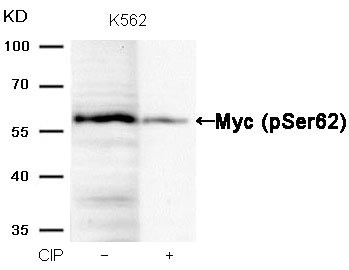 • Western blot analysis of extracts from K562 cells, treated with calf intestinal phosphatase (CIP), using Myc (Phospho-Ser62) Antibody.