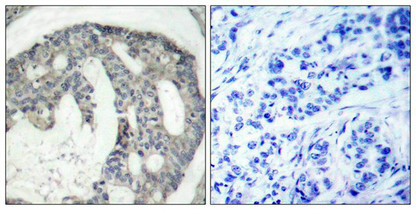 • Immunohistochemical analysis of paraffin-embedded human breast carcinoma tissue using eNOS(Phospho-Ser1177) Antibody(left) or the same antibody preincubated with blocking peptide(right).