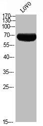 • Western blot analysis of LOVO using p-p70 S6 kinase α (T444) antibody.