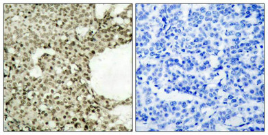 Immunohistochemical analysis of paraffin-embedded human breast carcinoma tissue using STAT1(Phospho-Ser727) Antibody(left) or the same antibody preincubated with blocking peptide(right).