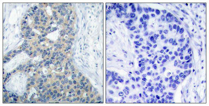Immunohistochemical analysis of paraffin-embedded human breast carcinoma tissue using Stathmin 1(Phospho-Ser38) Antibody(left) or the same antibody preincubated with blocking peptide(right).