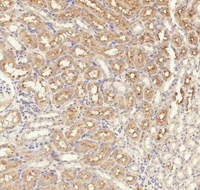 • Immunohistochemical analysis of paraffin-embedded Rat-kidney tissue. 1,TGFβ RI (phospho Ser165) Polyclonal Antibody was diluted at 1:200(4°C,overnight). 2, Sodium citrate pH 6.0 was used for antibody retrieval(>98°C,20min). 3,Secondary antibody was diluted at 1:200(room temperature, 30min).
