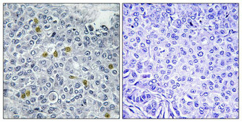 Immunohistochemistry analysis of paraffin-embedded human breast carcinoma tissue using TOP2A (Phospho-Ser1106) antibody. The picture on the right is treated with the synthesized peptide.
