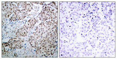 • Immunohistochemical analysis of paraffin-embedded human breast carcinoma tissue using p53(Phospho-Ser315) Antibody(left) or the same antibody preincubated with blocking peptide(right).