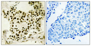 Immunohistochemistry analysis of paraffin-embedded human breast carcinoma tissue using UBF (Phospho-Ser484) antibody. The picture on the right is treated with the synthesized peptide.