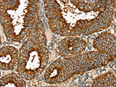 The image on the left is immunohistochemistry of paraffin-embedded Human thyroid cancer tissue using CSB-PA970337(RAB25 Antibody) at dilution 1/35, on the right is treated with fusion protein. (Original magnification: ×200)