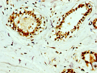 • IHC image of CSB-PA614887LA01HU diluted at 1:400 and staining in paraffin-embedded human breast cancer performed on a Leica BondTM system. After dewaxing and hydration, antigen retrieval was mediated by high pressure in a citrate buffer (pH 6.0). Section was blocked with 10% normal goat serum 30min at RT. Then primary antibody (1% BSA) was incubated at 4°C overnight. The primary is detected by a biotinylated secondary antibody and visualized using an HRP conjugated SP system.