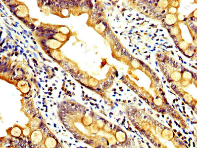 • IHC image of CSB-PA614887LA01HU diluted at 1:400 and staining in paraffin-embedded human small intestine tissue performed on a Leica BondTM system. After dewaxing and hydration, antigen retrieval was mediated by high pressure in a citrate buffer (pH 6.0). Section was blocked with 10% normal goat serum 30min at RT. Then primary antibody (1% BSA) was incubated at 4°C overnight. The primary is detected by a biotinylated secondary antibody and visualized using an HRP conjugated SP system.