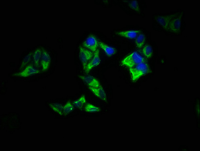 • Immunofluorescence staining of Hela cells with CSB-PA019321LA01HU at 1:200, counter-stained with DAPI. The cells were fixed in 4% formaldehyde, permeabilized using 0.2% Triton X-100 and blocked in 10% normal Goat Serum. The cells were then incubated with the antibody overnight at 4°C. The secondary antibody was Alexa Fluor 488-congugated AffiniPure Goat Anti-Rabbit IgG(H+L).