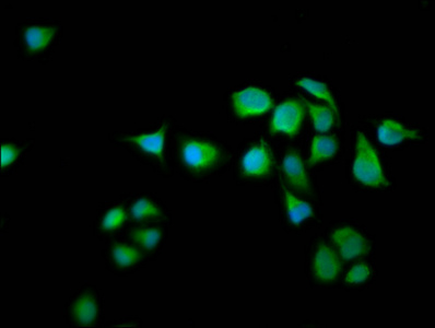 Immunofluorescence staining of Hela cells with CSB-PA890908LA01HU at 1:66, counter-stained with DAPI. The cells were fixed in 4% formaldehyde, permeabilized using 0.2% Triton X-100 and blocked in 10% normal Goat Serum. The cells were then incubated with the antibody overnight at 4°C. The secondary antibody was Alexa Fluor 488-congugated AffiniPure Goat Anti-Rabbit IgG(H+L).