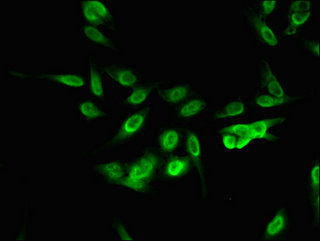 Immunofluorescent analysis of Hela cells using CSB-PA019400LA01HU at dilution of 1:100 and Alexa Fluor 488-congugated AffiniPure Goat Anti-Rabbit IgG(H+L)