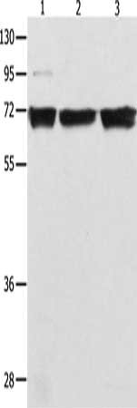 • Gel: 10%SDS-PAGE, Lysate: 40 μg, Lane 1-3: 293T cells, K562 cells, Jurkat cells, Primary antibody: CSB-PA037612(RELA Antibody) at dilution 1/500, Secondary antibody: Goat anti rabbit IgG at 1/8000 dilution, Exposure time: 5 seconds